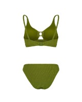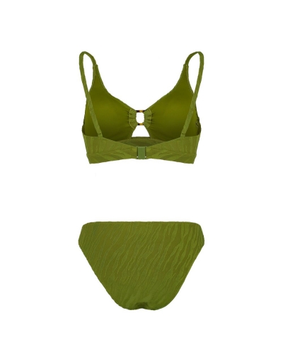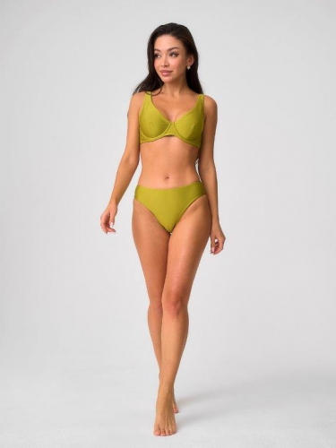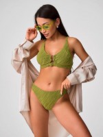 Раздельный купальник с чашкой soft bra из мягкого фактурного полотна. Бюстгальтер с мягкой чашкой,с подкладом и съемными формованными вкладышами. Без каркасов и без боковых корсетных вставок. Пластиковая деталь цвета янтаря соединяет чашки спереди. Бретели регулируемые, несъемные.Пластиковая застежка на спине. Плавки на подкладе, со средней посадкой. Тонкая резинка, подгиб и плоский шов по талии и срезу ножек.Декоративный завязывающийся пояс по линии талии из ткани купальника