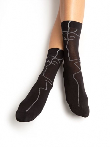 Непрозрачные матовые носки плотностью 70 ден, выполненные из мягкой микрофибры с контрастным узором "силуэт" на фронтальной части. У модели усиленный мысок и комфортная широкая резинка.