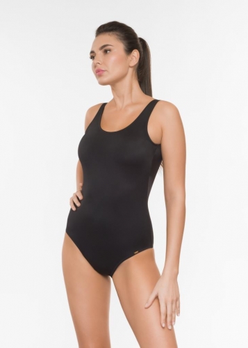 Сплошной купальник. Закрытый классический купальник. Перед продублирован подкладочной тканью. Детали спинки соединены широкой лентой с логотипом.