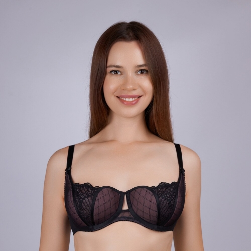 2141. Бюстгальтер на каркасах из эластичной сетки и эластичного кружева. Чашка частично дублирована, по центру имеет декоративную вставку из кружева. Ластовица имет декоративный вырез.