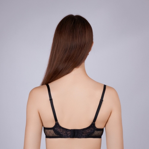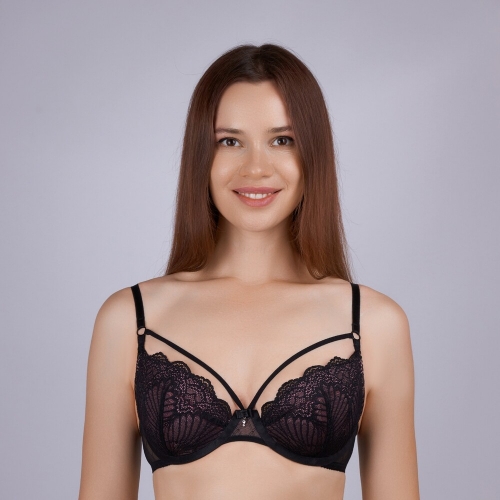 2142. Бюстгальтер пуш-ап на каркасах из эластичного кружева и эластичной сетки. Чашка на дубляже с вкладышами. В зоне декольте имеются декоративные тесьмы. Спинка декорирована кружевом. Состав: 40%ХБ 50%ПА 10%ЭЛ.