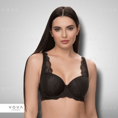 Бюстгальтер с поролоновыми чашками на каркасах. Чашки из 3-х кружевных частей с вертикальными швами. Форма чашек бюстгальтера обеспечивает округлую форму и красивое расположение груди. Боковая деталь чашки переходит в бретель, обеспечивающую дополнительную поддержку.