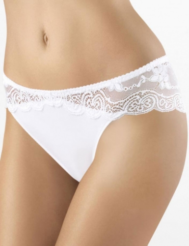 Трусы-слип со средней линией талии. Передняя деталь выполнена из эластичного полотна. Эластичное кружево расположено по талии, переходя на заднюю деталь изделия.
