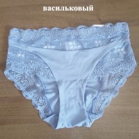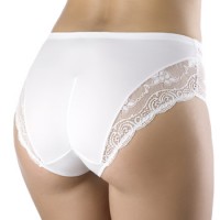 Трусики со средней линией талии. Линия бедра закрыта. По ножкам украшены кружевными деталями. Перед и спику изделия украшает вставка из кружева. По талии настрочена окантовка-пояс из полотна с эластичной лентой внутри. Сборка по задней детали в области ягодиц создает легкий, визуальный эффект "push-up".