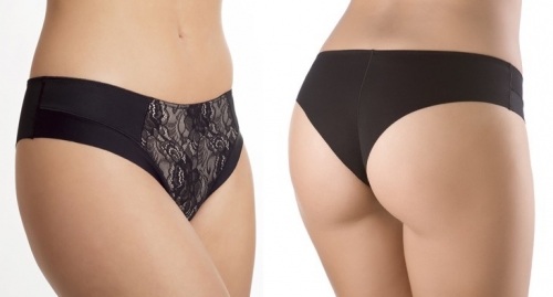 Трусы-танга со средней линией талии. На передней детали вставка из кружевного полотна, продублированного хлопком. Ткань с плоскими бесшовными краями делает трусы незаметными под облегающей одеждой.